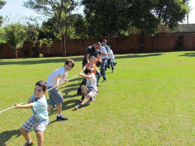 Após o almoço, pais e filhos formavam as equipes para dar início a uma divertida e acirrada competição de “cabo de guerra”.