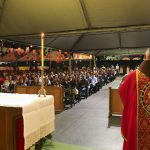 Com o intuito de pedir a Deus e a Nossa Senhora que abençoasse a Festa e todas as pessoas que ali estariam, a primeira atividade foi a celebração da Santa Missa, às 18:30 h. Ato contínuo, teve uma procissão com músicas, levando a bandeira de São Pedro e São Paulo, até o centro do local onde teria lugar a Festa. Aí, foi hasteada a mencionada bandeira, a fim de que os Santos abençoassem desde o Alto todas as atividades que em breve se desenrolariam.