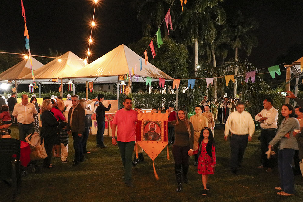 Com o intuito de pedir a Deus e a Nossa Senhora que abençoasse a Festa e todas as pessoas que ali estariam, a primeira atividade foi a celebração da Santa Missa, às 18:30 h. Ato contínuo, teve uma procissão com músicas, levando a bandeira de São Pedro e São Paulo, até o centro do local onde teria lugar a Festa. Aí, foi hasteada a mencionada bandeira, a fim de que os Santos abençoassem desde o Alto todas as atividades que em breve se desenrolariam.