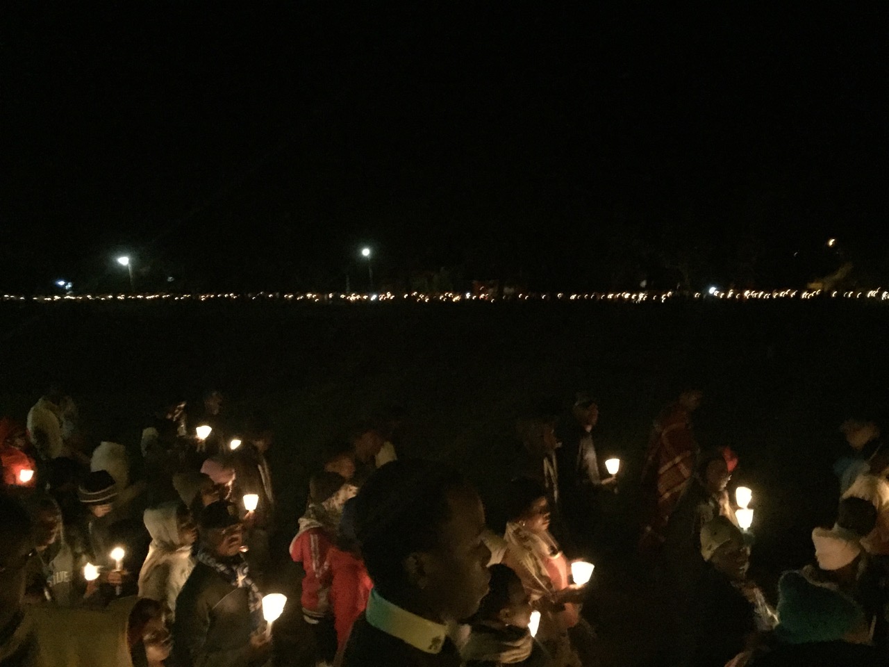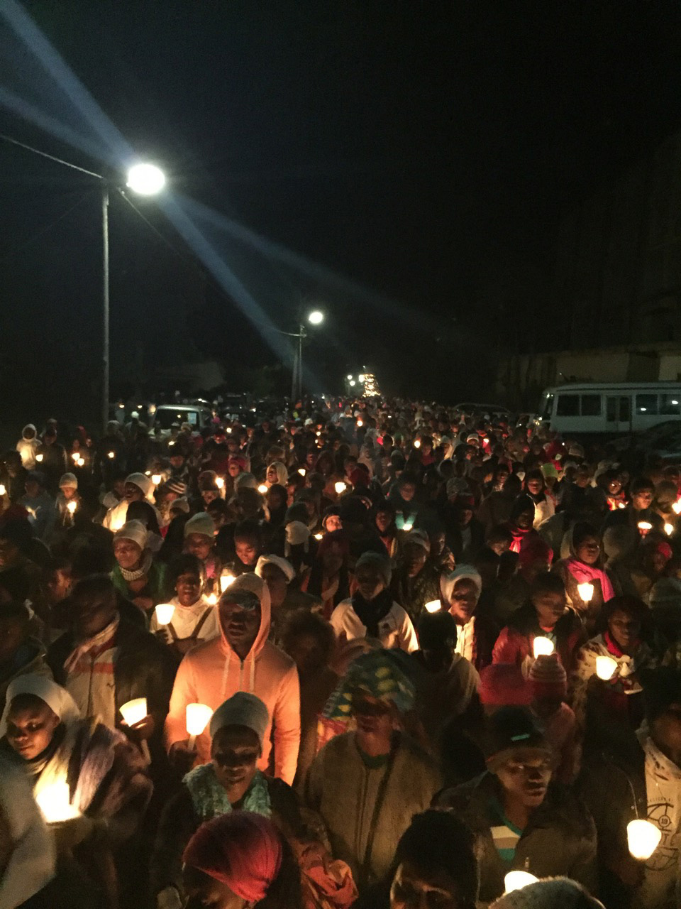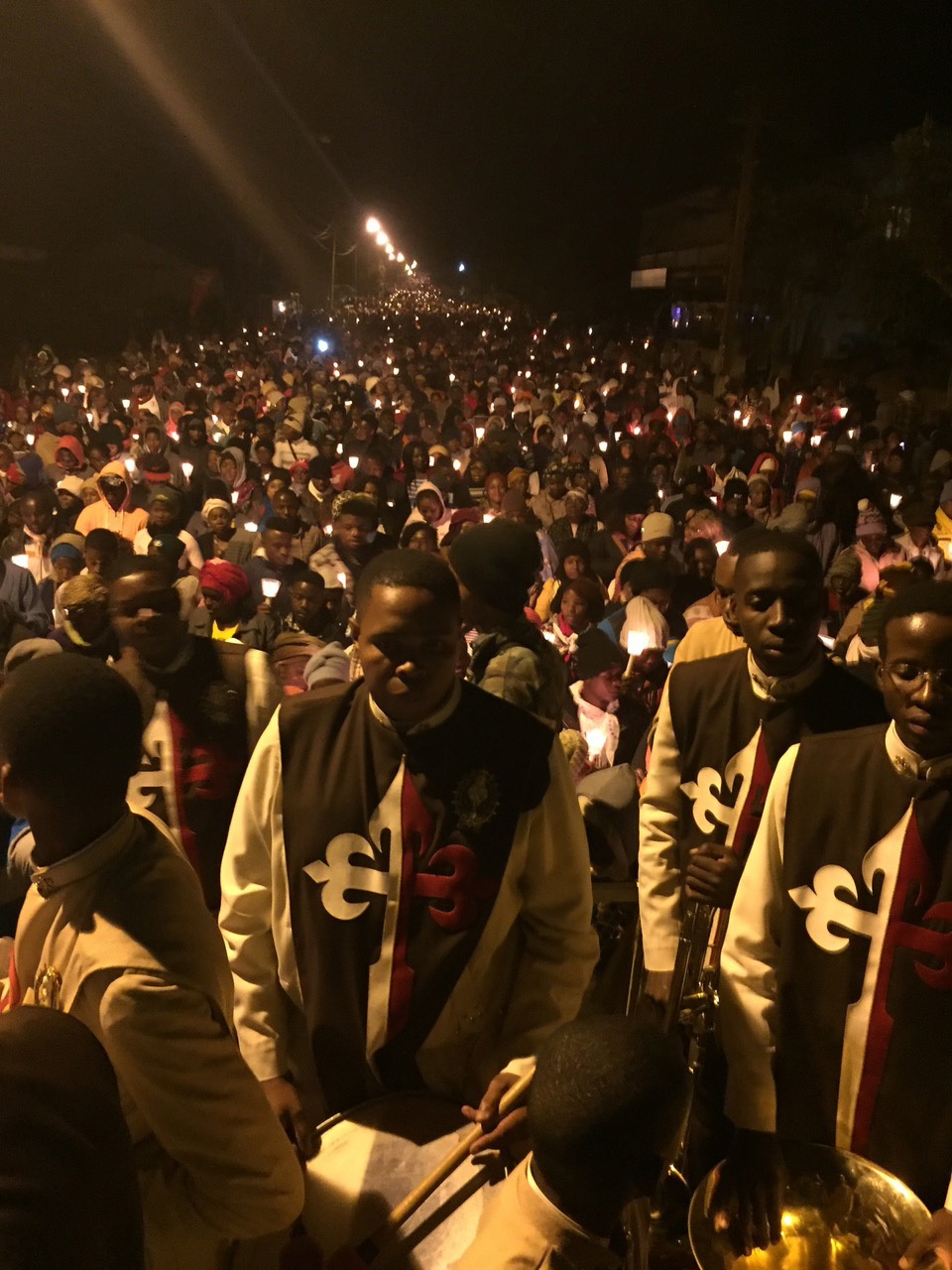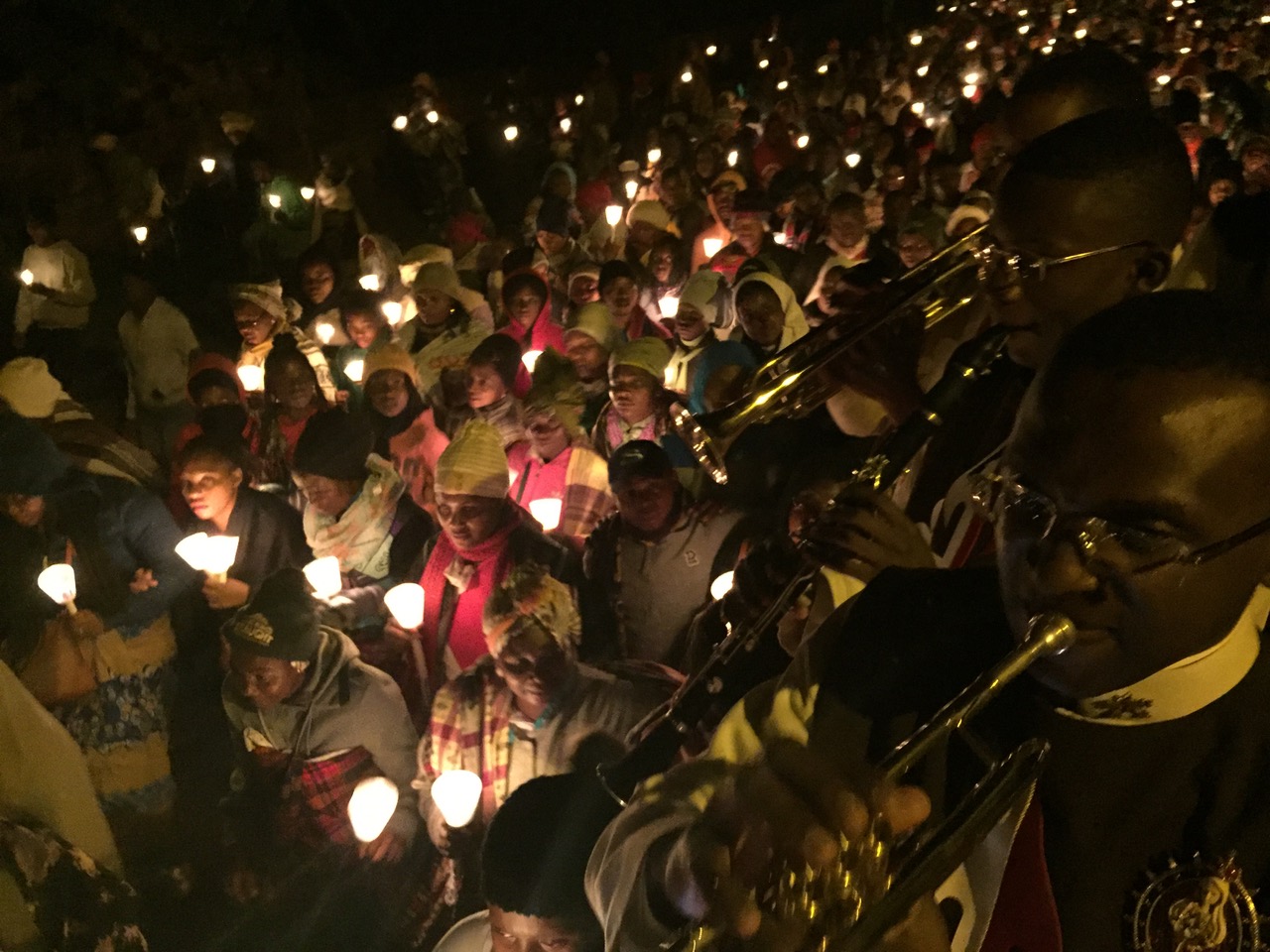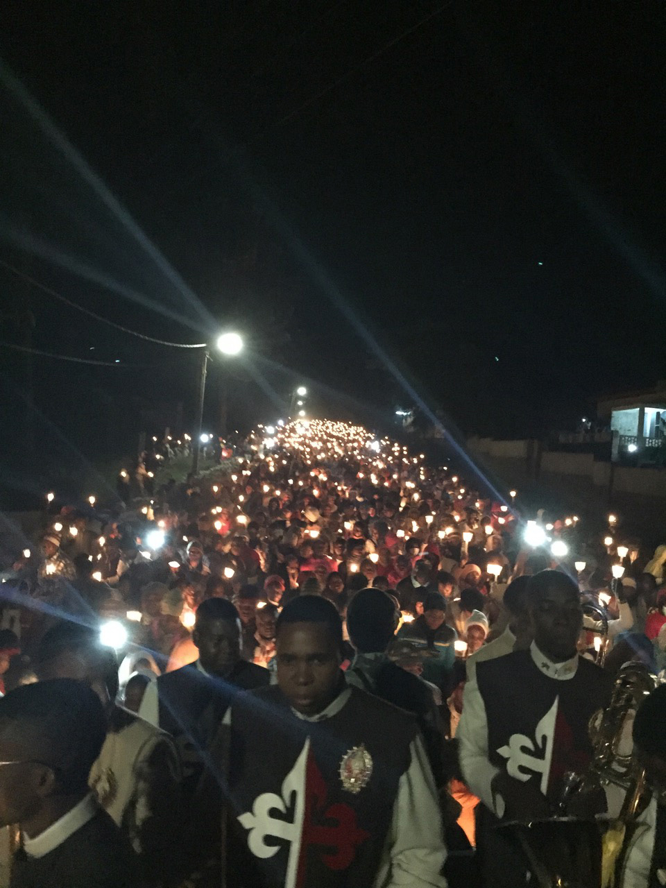 Passando frio e fome, com os corpos extenuados e muitos sem poder caminhar pela dureza da travessia, o cansaço é totalmente esquecido durante a procissão onde o sangue africano, com o pitoresco e a alegria que a Providencia privilegiou este povo, louva a Mãe de Deus e Senhora deles. Os cantos são na maioria em dialeto local.