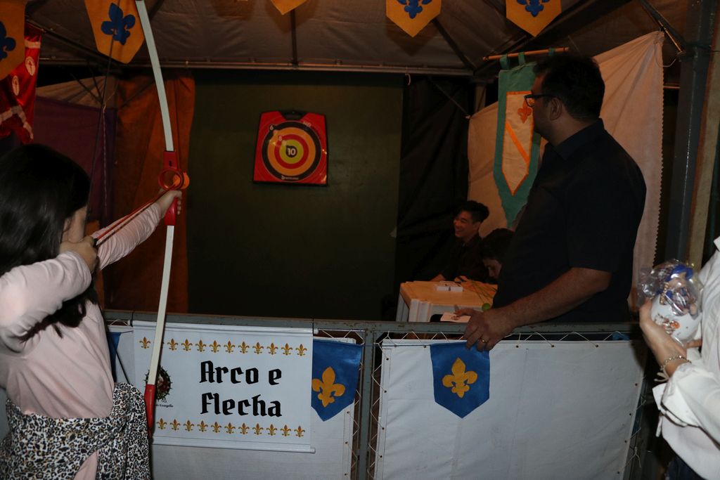 Terminada a Santa Missa, o Revmo. Pe. Mário procedeu à bênção do fogo e, na sequência – para surpresa e alegria geral – um Cavaleiro Medieval chegou, devidamente montado, trazendo o belo estandarte de São Pedro e dando oficialmente o tom do tema medieval da festa Julina.