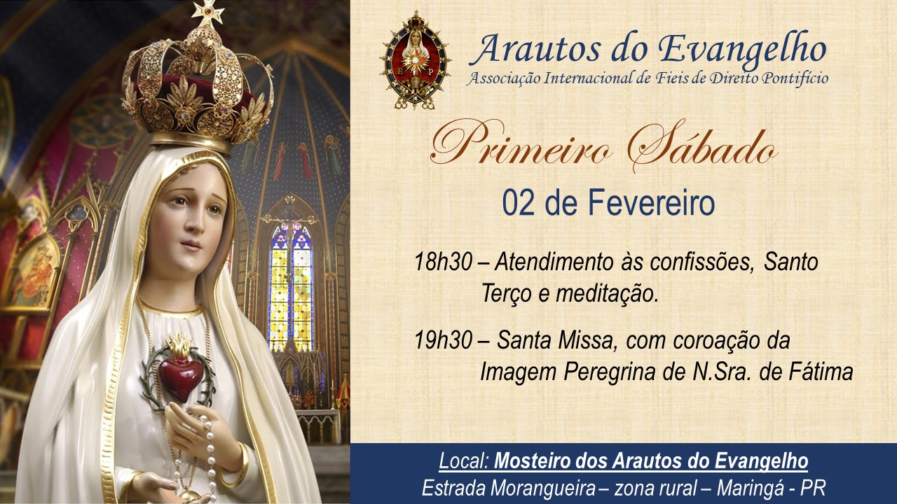 O próximo sábado, dia 02 de Fevereiro, será o primeiro sábado do mês! Os Arautos do Evangelho de Maringá promoverão a Comunhão Reparadora dos Primeiros Sábados, atendendo aos apelos de Nossa Senhora, na Mensagem de Fátima.