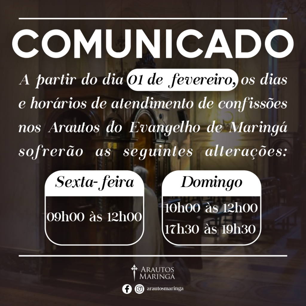 Confira os novos dias e horários de atendimento de confissões nos Arautos do Evangelho de Maringá: