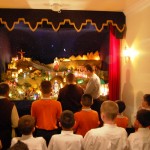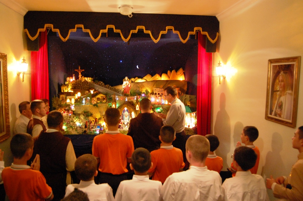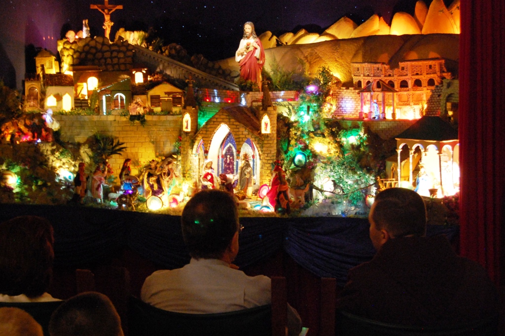 Depois, o excelentíssimo visitante quis continuar reverenciando a Nosso Senhor Jesus Cristo, mas agora de outra maneira: contemplando-O feito Menino, inocente e belo, no Presépio. Entrou, então, no auditório climatizado, ornamentado com uma grande e bela cortina vermelha, aguardando o instante de poder abrir-se e revelar as maravilhas do nascimento do Menino Jesus. Todos se sentam. Começa uma narração… São as graças e as alegrias do Santo Natal que vem até nós.