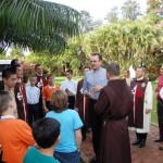 Descendo do carro, cumprimentou a todos e a cada um com grande afeto, estima e ternura. Saudou de uma maneira especial os dois Sacerdotes Arautos que se encontravam na casa. Primeiramente, o Revmo. Padre Roberto Takeshi Kiyota, Capelão da Comunidade. Depois, o Revmo. Padre Antônio Guerra, Provincial dos Arautos do Evangelho de Maringá, o qual se encontrava também em visita à Comunidade nessa ocasião.