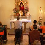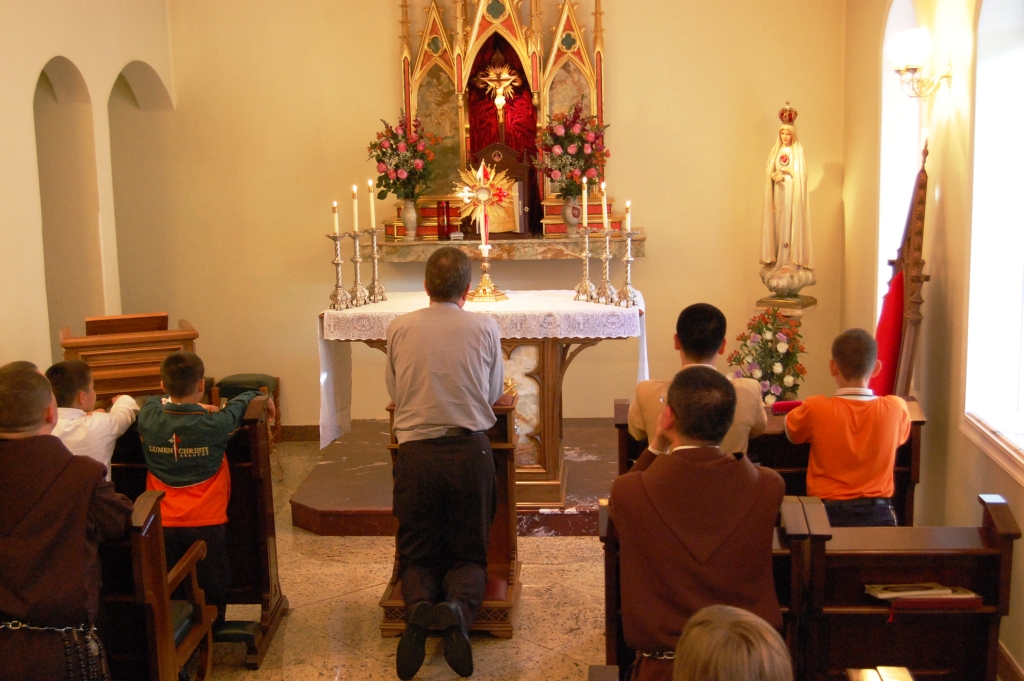 Em seguida, o Arcebispo quis também cumprimentar de uma maneira especial o “Dono da Casa”, o Santíssimo Sacramento. Visitou a Capela e fez alguns minutos de oração e reverência a Nosso Senhor, realmente presente em Corpo, Sangue, Alma e divindade na Eucaristia. Exemplo de devoção para nós. Sempre que tivermos a alegria de comungar e, assim, receber a visita do próprio Homem-Deus em nossa alma, tenhamos a essa devoção, transbordante de adoração.