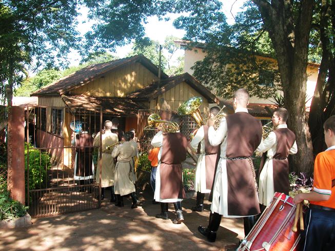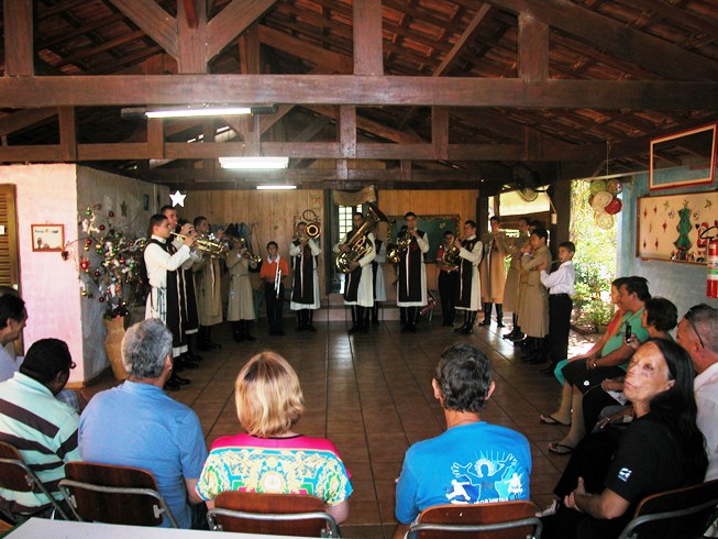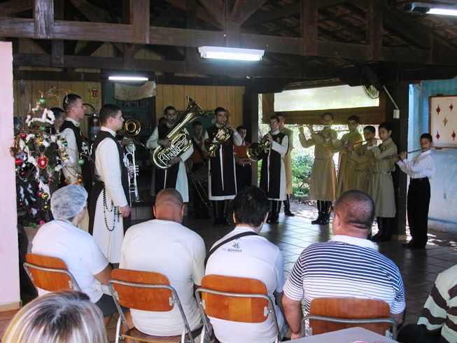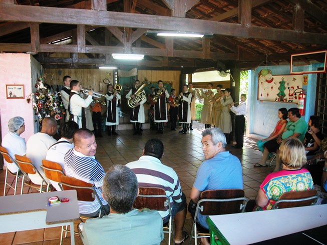 Para fazer surpresa, a banda entrou na instituição já executando músicas e depois continuou a apresentação em uma agradável varanda, que nos trouxe a curiosa impressão de estarmos tocando dentro de um presépio, cercados por olhares curiosos e agradados dos presentes, que como quê faziam as vezes dos pastores e dos reis magos.